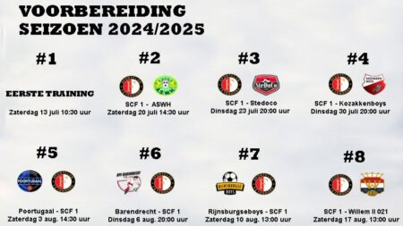 Voorbereiding seizoen 2024/2025 Sportclub Feyenoord 1 Zaterdag 13 juliEERSTE TRAINING Zaterdag 20 juli, aanvang 15:00 uur (let op; gewijzigd)ASWH – SC FEYENOORD Dinsdag 23 juli, aanvang 20:00 uurSC FEYENOORD – STEDOCO Dinsdag 30 juli, aanvang 20:00 uurSC FEYENOORD – KOZAKKEN BOYS Zaterdag 3 augustus, aanvng 14:30 uurPOORTUGAAL – SC FEYENOORD Dinsdag 6 augustus, aanvang 20:00… Continue reading Planning voorbereiding SC1